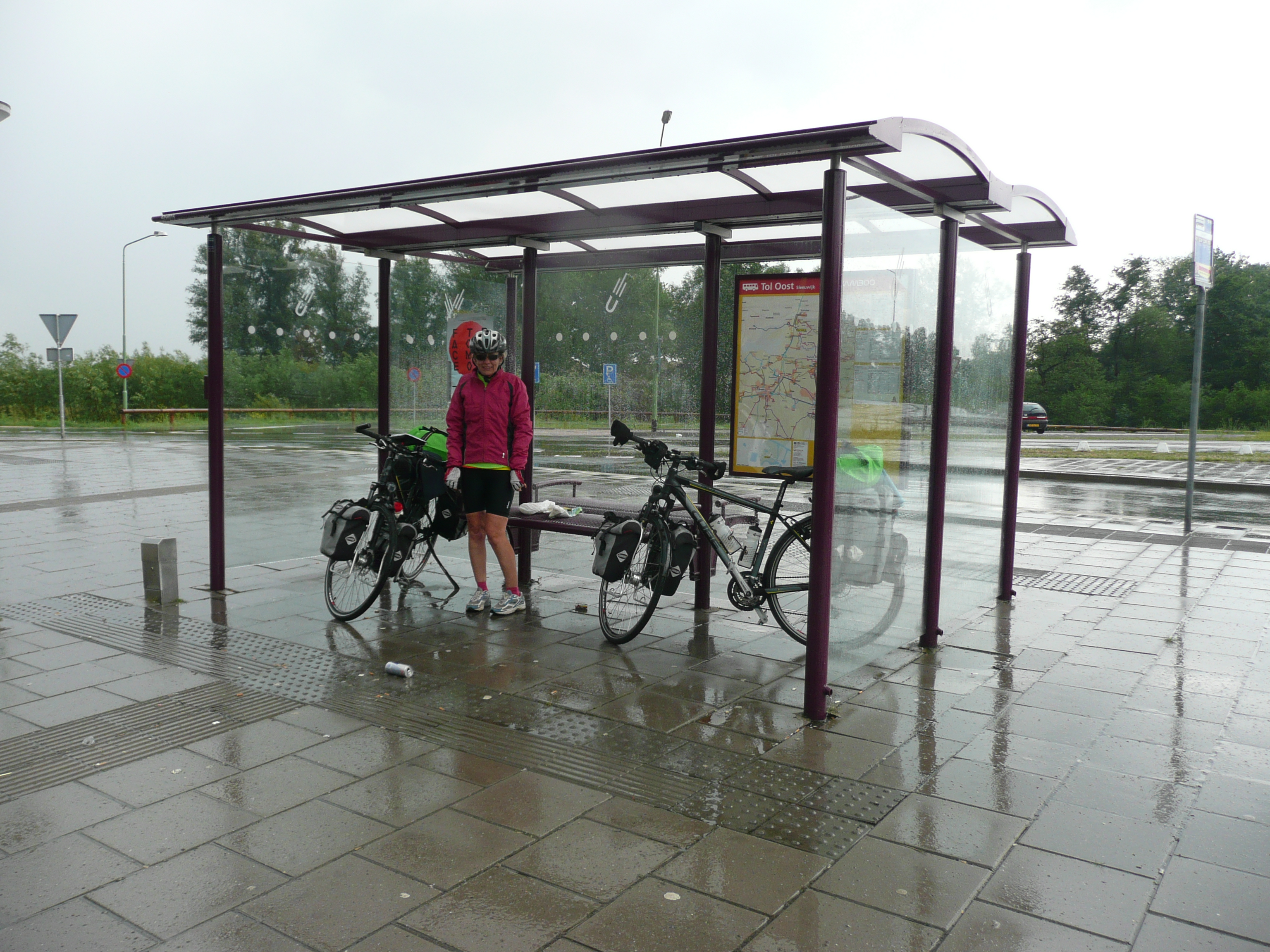 The sky is dark with threatening clouds and there is a strong gusty wind. A very different day to yesterday. We take a break for lunch in a bus shelter during a sudden cloud-burst which threatens to wash us away before we do battle with a wind that threatens to blow us away. We cut the day short in the large city of ´s-Hertogenbosch so that we can find a hotel to dry out our camping stuff, as well as finding a WiFi connection. McDonalds turns out to be the best place for WiFi, where we get so engrossed in uploading our photos to ´Biketrippin´ that we don´t notice that it closes and the staff lock up, locking us in (Ken´s idea of heaven – being trapped with fast-food all night). Fortunately, the cleaner finds us tapping away on the computer and lets us out so we don´t spend all night in there. We´ll need to return tomorrow to update the journal.