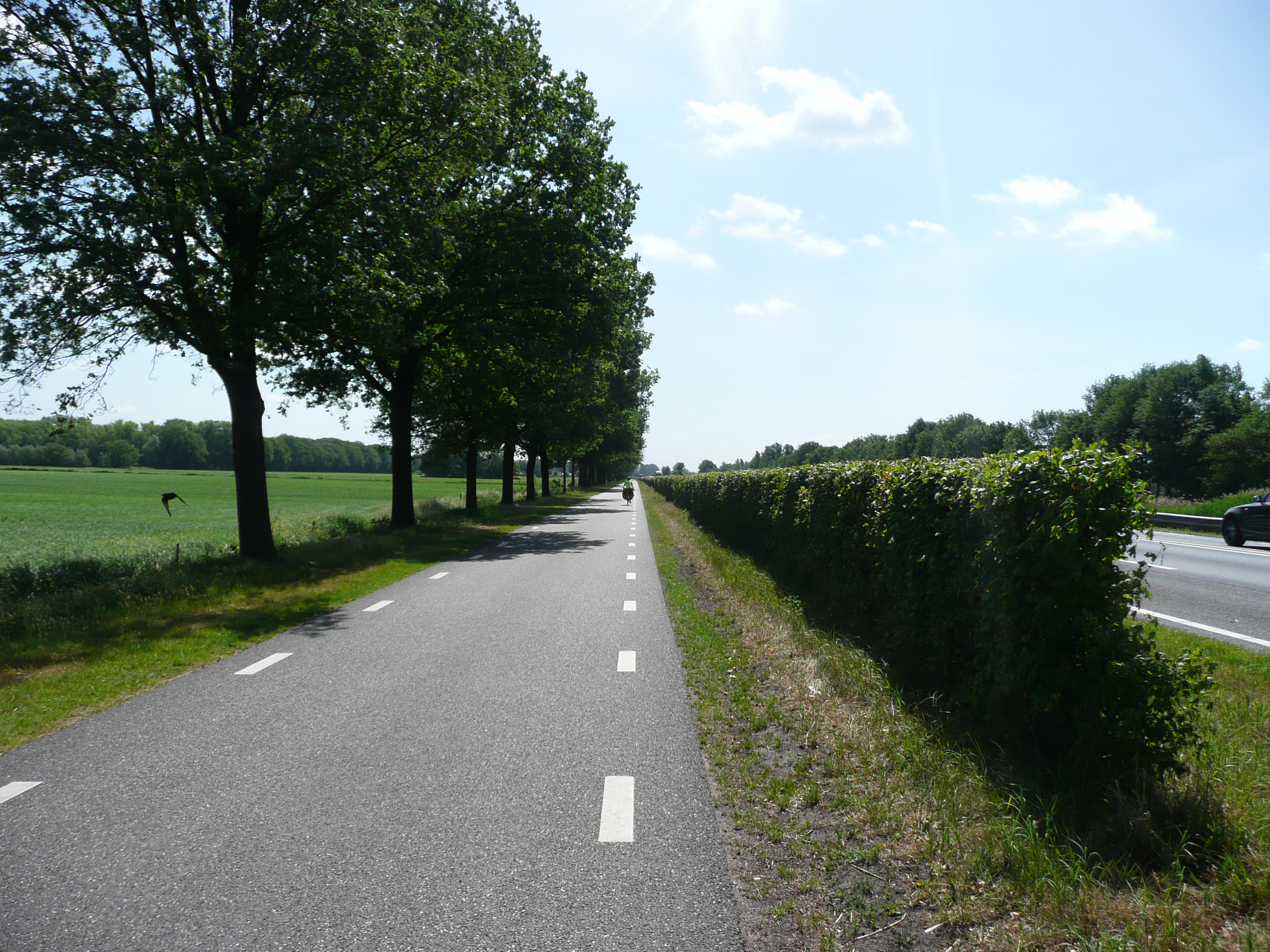 The sun is out and the cycling is easy. We travel for about 20 km along a cycle track which runs right alongside a canal, where huge working barges slowly make their way along, which, in turn, runs alongside a main road. We often see trains passing in the distance – Holland certainly has a ‘green’ transport policy and it looks like it is working, because of all the places we have been on the bikes so far, Holland seems to have the lightest amount of road traffic.