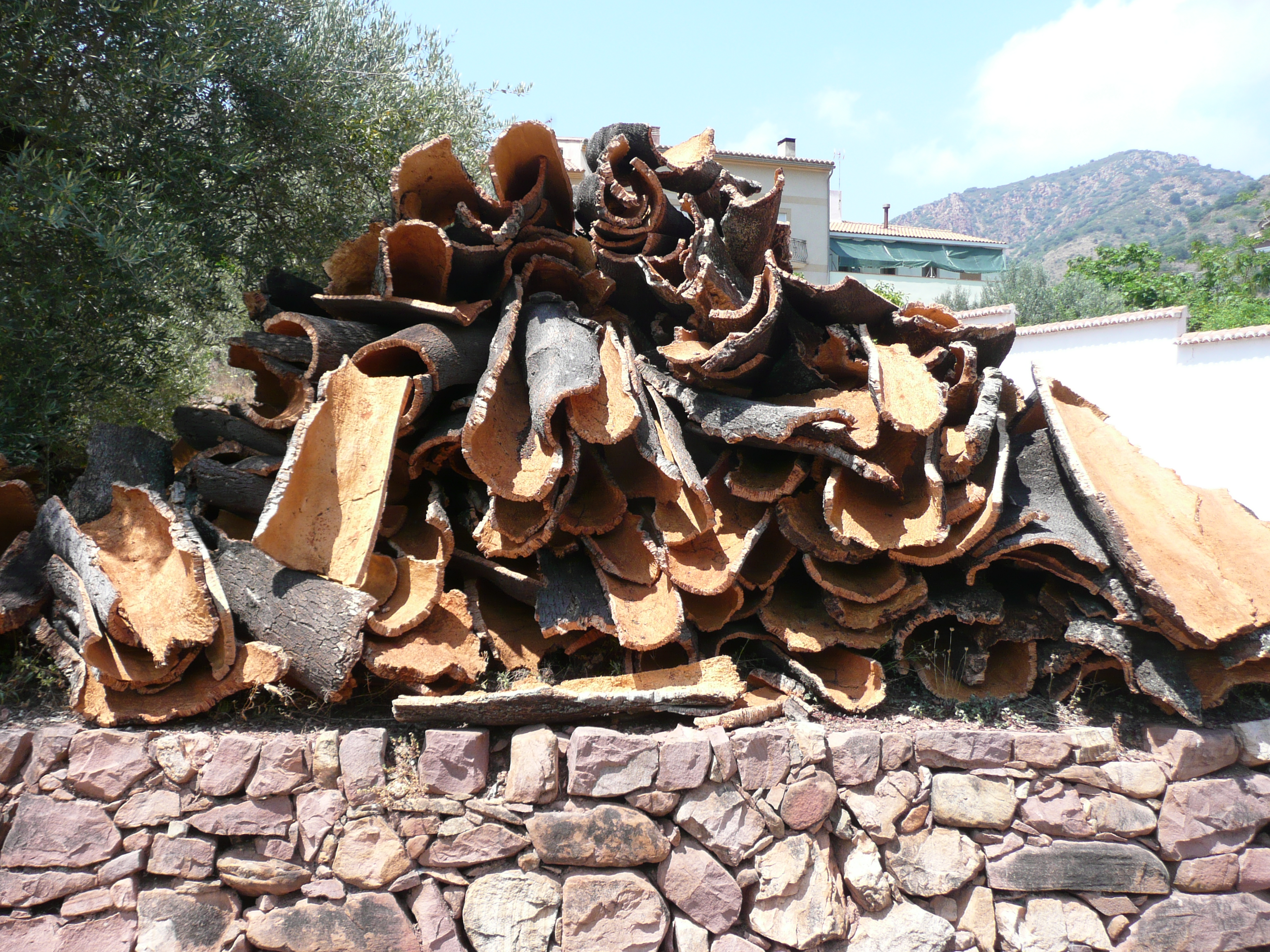 It is already very hot when we start out on a very small mountain road up to a pass some 20 km ahead. We’re in really wild countryside – during our climb we see not a soul – neither on foot nor in a vehicle. The people who live in these parts make their living from harvesting the cork from the cork oaks growing all over the mountainside. There are piles of the cut cork at the side of the road as we ride by.