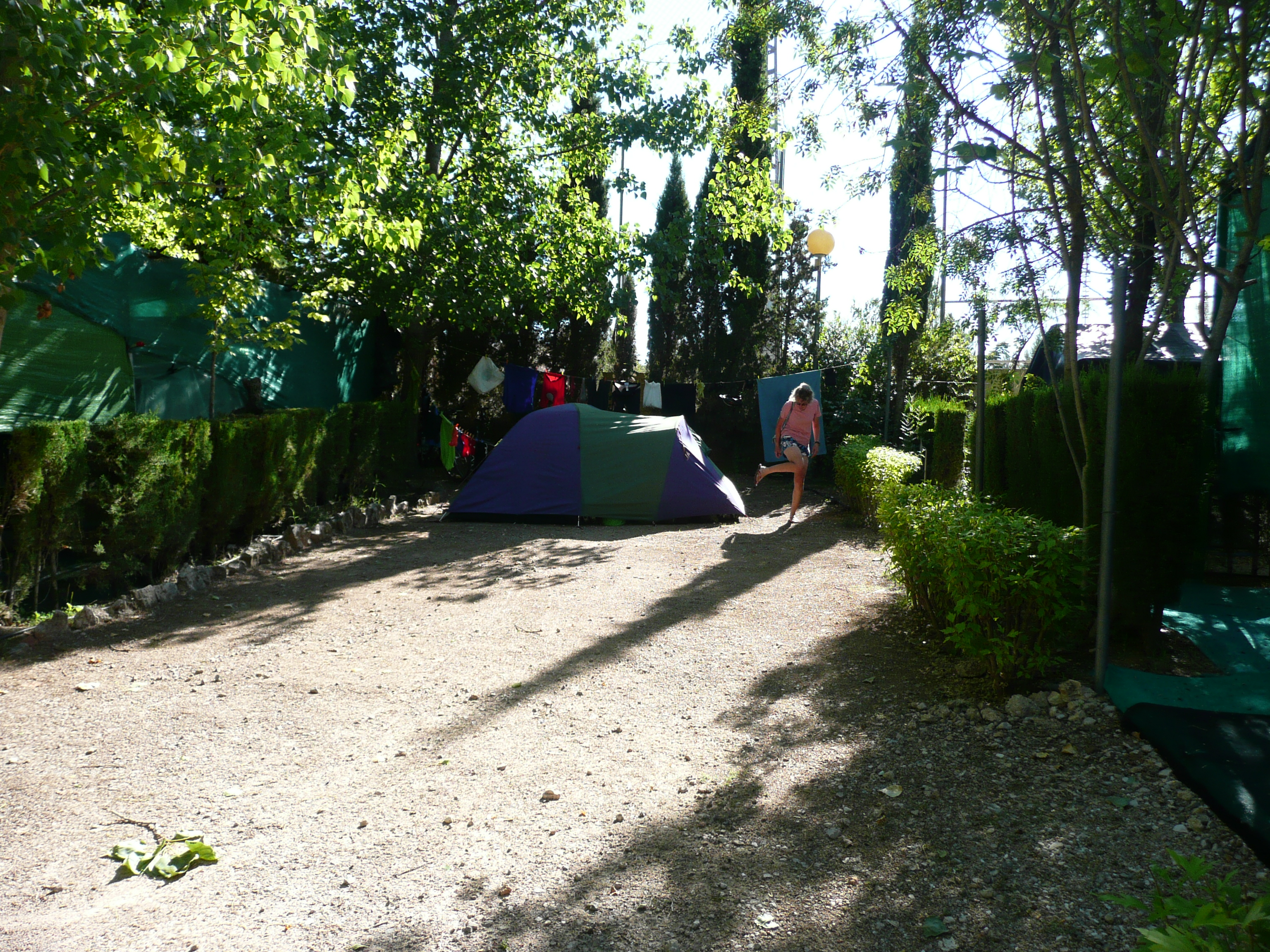 The first part of the ride is a succession of hills rather than the mountains we have been climbing of late. Without the challenge of reaching a summit or pass they seem a bit mundane, although the road is quiet and we pass through some nice little villages. When we reach the main road it is not too busy and, like all the main roads in Spain, has a separate lane at the side of the road which we can ride in safely. Although we are making good progress we stop at 73 km when we reach Jarafuel because it is marked on the map as having camping and it is a long way to the next place on our route. Interestingly, there are two signs in the town giving directions to the camp-site – each pointing in the opposite direction – we choose the wrong one. After a fruitless ride in completely the wrong direction we turn around and find what we are looking for. There is no room on the site – all the pitches have caravans on them, although the owners are not actually there – they just use them at the weekend. The man running the site does let us on though and tells us to pitch our tent on the roadway – our tent pegs now look like they have been struck by lightning after knocking them into a stone track. Good job we’ve become accustomed to sleeping on hard surfaces.