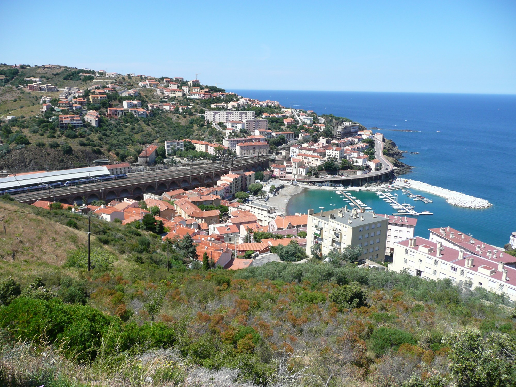 The wind is troublesome again but the scenery is spectacular which takes our minds off the hard work we are having to do just to make a little progress. The terrain is up and down with twists and turns all the way along a rocky coastline, with bays and coves and little villages all the way, which reminds us of North Devon or Cornwall. Eventually we cross the border into Spain and arrive very hot and sweaty in Llança, find yet another dismal camp-site, which we again reject, and decide to stay in a hostal overnight instead.