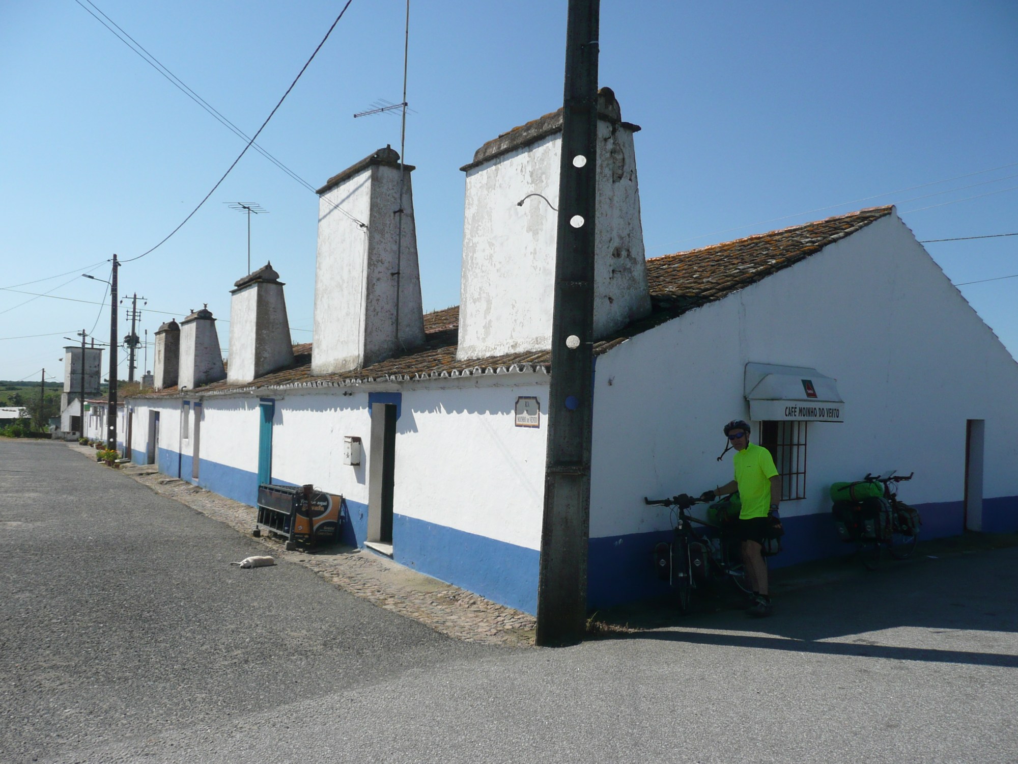 We intended to get up and off early this morning, but we were woken earlier than intended when the Portuguese welcomed their national holiday to celebrate moving from a dictatorship to a democracy with copious fireworks at midnight. This caused every dog in Portugal to have a half-an-hour barking session. About an hour later two cats had a noisy fight outside our tent. We didn’t feel very energetic when we eventually got ourselves up, packed and on the road. Strangely it always feels harder work riding the bikes after a day off – somehow you lose the flow. The saddle sores did feel much better much to my relief.