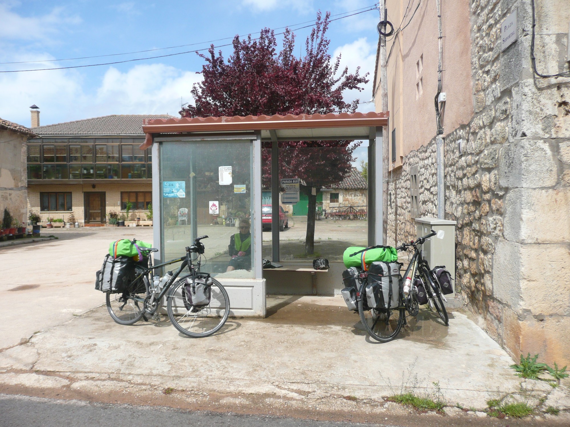 The route turns out to be one of those very gradual climbs that you hardly notice, although we realise that we are pretty high as there are snow markers all alongside the road. A few spots of rain keep falling but nothing much and the wind continues to be our friend. Pretty quickly we climb over the pass, giving us a spectacular view over the valley, before we drop right down again to the level of the river cutting its way through the mountains. The sun has decided to shine now through the clouds warming us up nicely – all-in-all the weather has been kind to us today despite the unpromising start to the day. With the wind continuing to blow us along we make quick progress and arrive in Villarcayo early enough to make a circuit or two of the town in order to select our accommodation. It turns out to be a bigger place than we thought and we have several options for places to stay as well as a good selection of places to eat. Let’s hope that the last full day of cycling in Spain tomorrow will go as well as it has today.