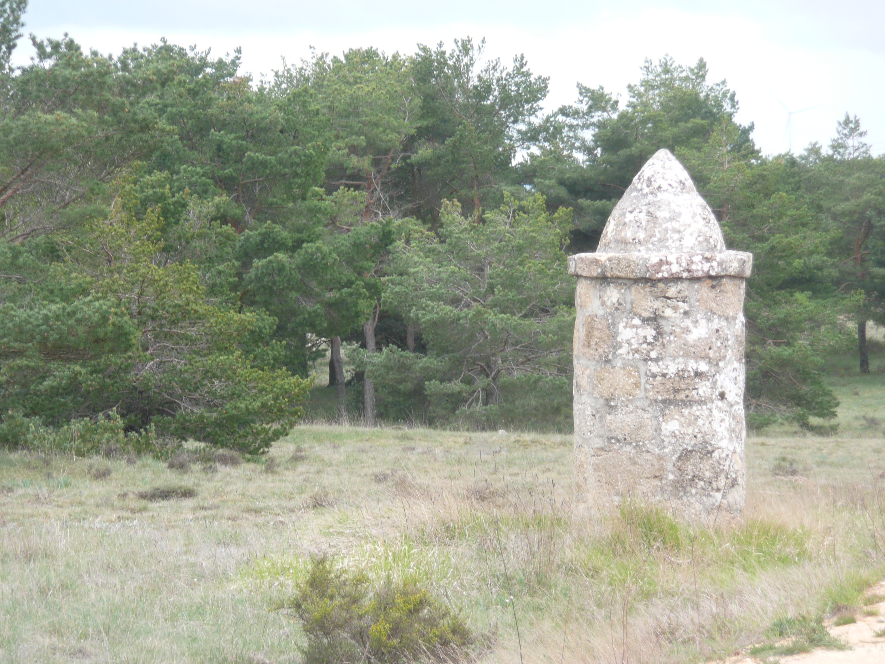 Getting out of Burgos is the usual battle with buses and lorries for a space on the road, negotiating multiple lane carriageways, huge roundabouts and traffic lights, and heaving a sigh of relief once we emerge out of the city. The rain has eased up into a fine drizzle and the wind turns out to be mostly in our favour. Some of the time it is a cross-wind, but as the road bends and turns it becomes a tail-wind and we fly along. We cycle along a road with limestone cliffs towering each side of the road before emerging onto open moorland. There are wind turbines on the horizon in every direction, clearly windy days are not unusual.