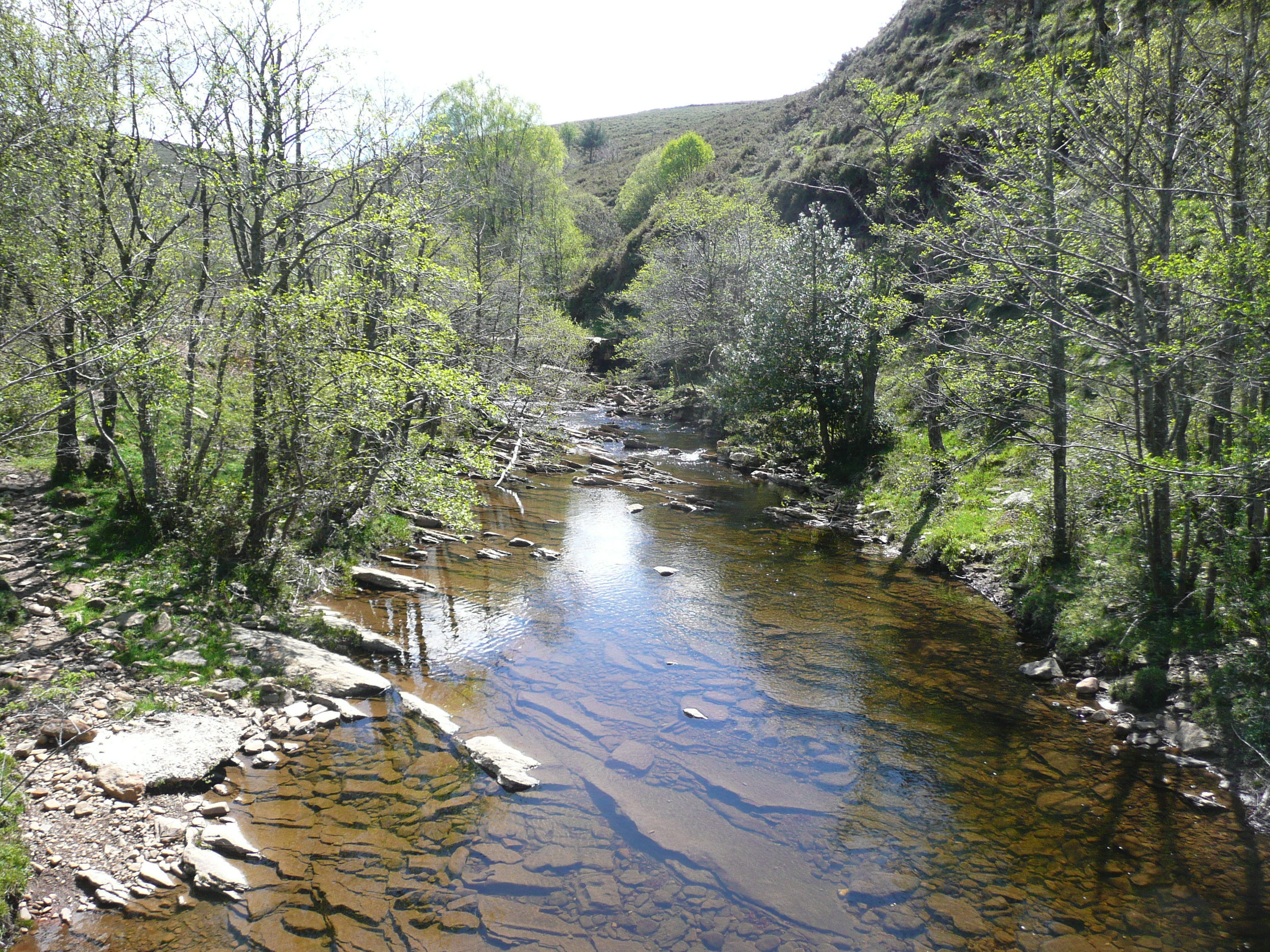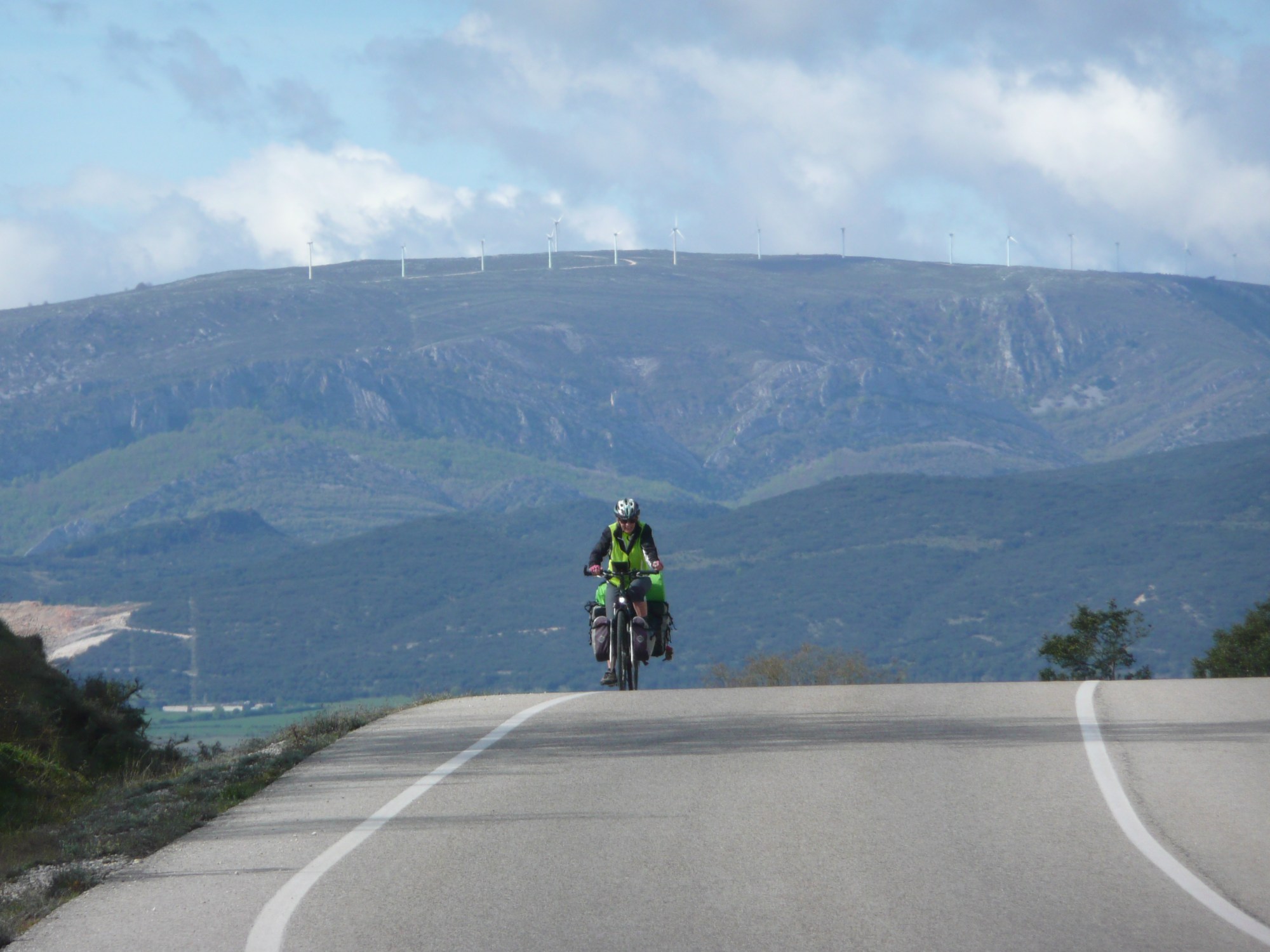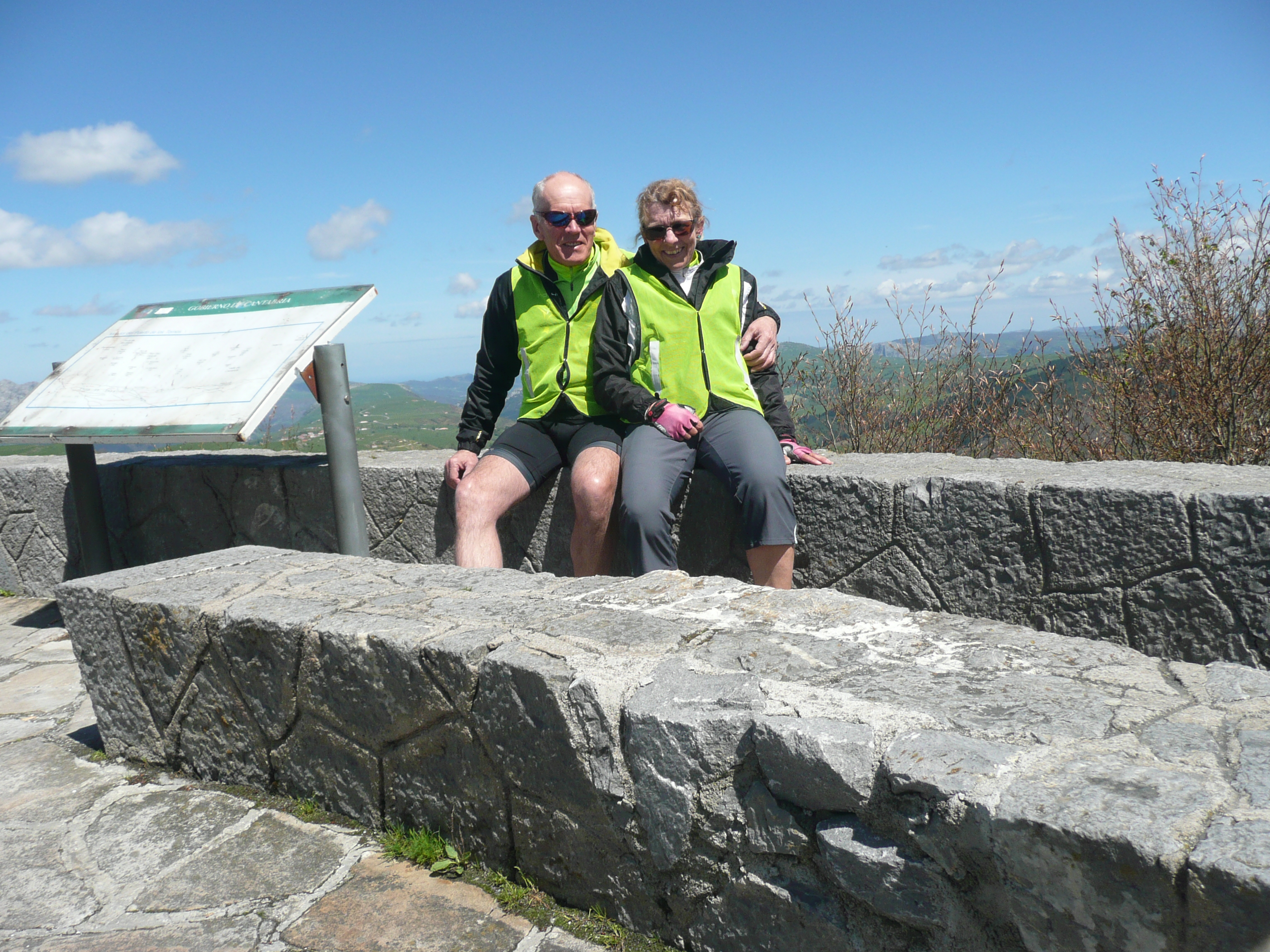 As it turned out the climb to the top of the first pass, Alto de Bocos, was the hardest work of the day. The pass was not high at 780 metres but the climb was made in only about 7 kilometres. Once up there the road continued along a ridge rather than downwards. We are surrounded by bright green pasture and the sound of cow-bells clanging. The sky is still blue and the sun shining, although it is cold and the wind is blowing hard. After a pit stop at a very welcome bar at a cross-road, we set off again heading for another mountain pass. This one is not in a hurry, taking around 20 kilometres to reach the top – much easier and once we get there – wow! what a view. From a viewing point right on the summit we can see the sea in the far distance and, spread far below us, a bright green patchwork of fields and trees which seem to sparkle in the sun. Speaking of which, we suddenly realise that we’re getting red bits, as we’ve forgotten all about putting on the mega expensive sun-cream. We spend an hour relaxing in the sun and after lunch set off downhill. This side of the mountain pretty well runs all the way down to the coast. We free-wheel for nearly 20 kilometres with the road running alongside a river that gets ever bigger as it runs to the sea.