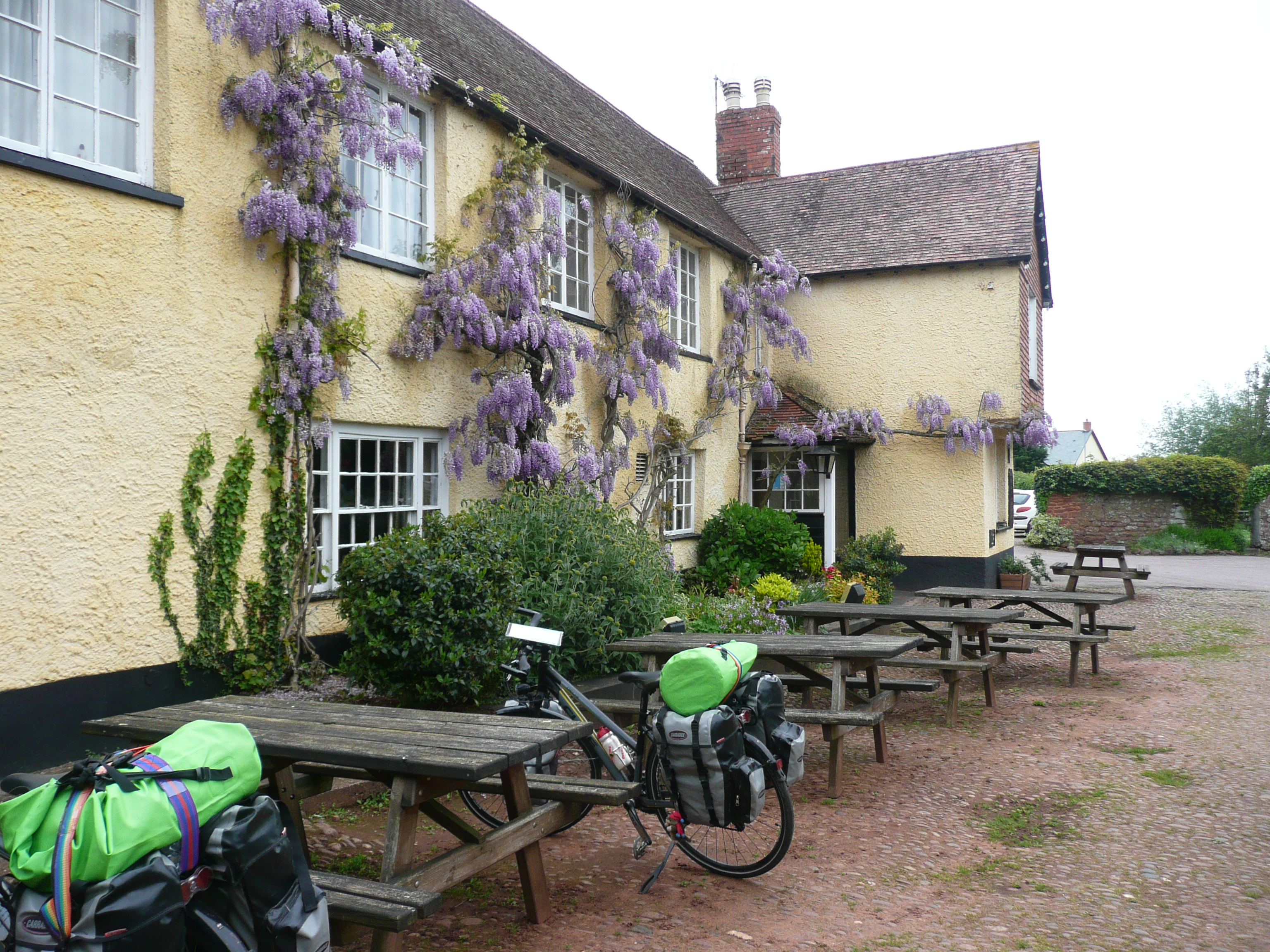 Not sure which way the weather’s going to go this morning – it’s cloudy and cool again. Our first task – to find our way out of Exeter. There are cycle paths but no signs to tell you where they are going, so we select one that seems to be heading where we want to go. With only one minor deviation round in a circle, we find our way out of the city and onto the road we want. The sun is starting to make an appearance, only a few weak, hazy sunbeams, but enough to light up the countryside to a brilliant green. We’re passing through agricultural fields, gone are the wild moorland scenes. There is a subtle scent on the air, instantly recognisable as the English countryside, no, not the smell of cow manure, but a mix of hawthorn blossom, cow parsley and nettles. It is very reminiscent of our cycling days when we lived in Aslockton.
