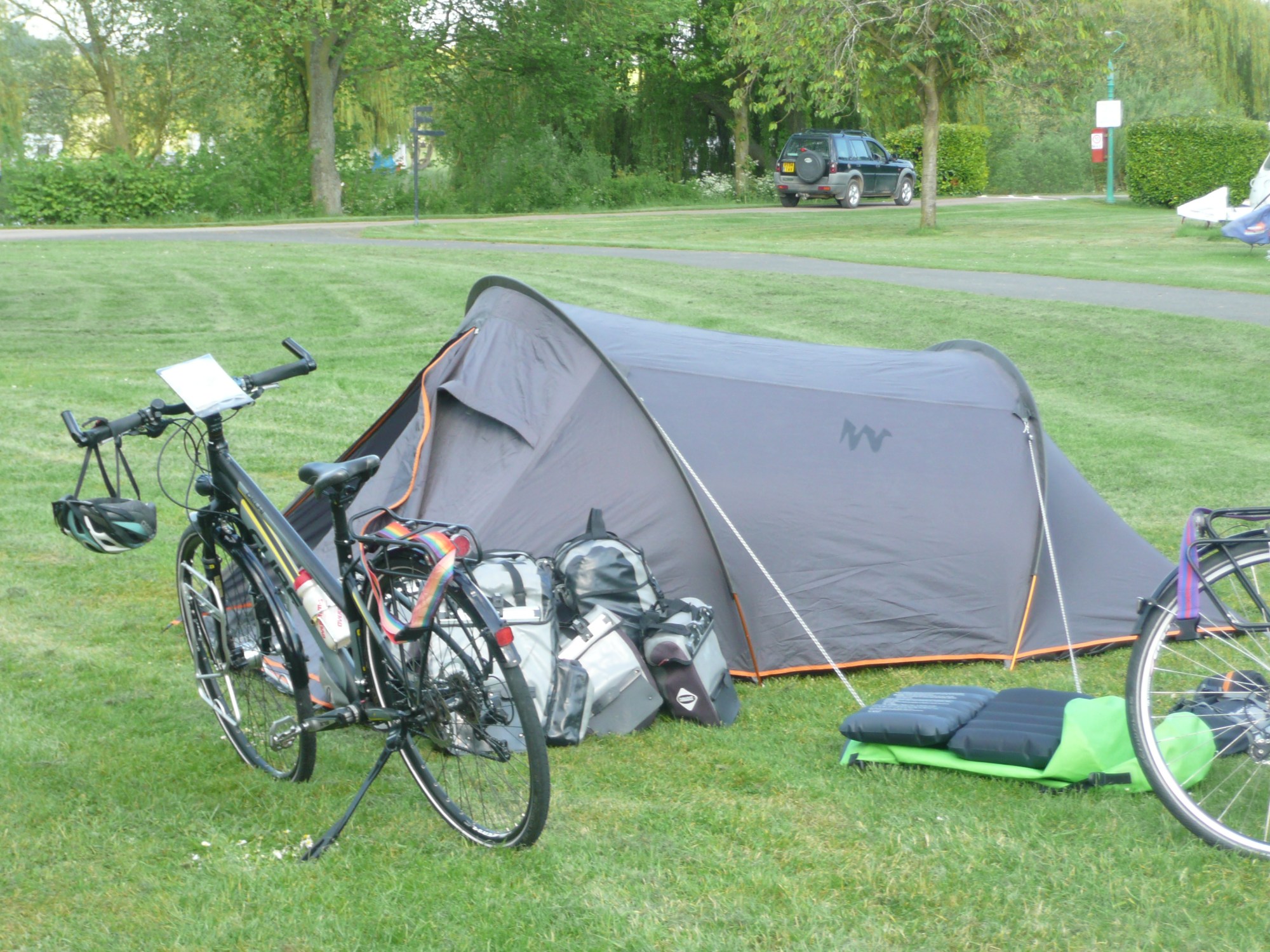 We haven’t identified an exact destination for the day but we want to cover about 80 kilometres. The lovely weather tempts us to think about camping tonight, although we are a bit worried that the sudden warm daytime temperature is misleading and overnight it may still be pretty cold. As it happens just before we hit 80 kilometres we are in a small village where we spot ‘The Queen’s Head Hotel’ – couldn’t be better timing. However, it turns out that they are fully booked, but they do tell me that there is a camp-site just a short distance outside the village. Looks like fate has decided that we will be camping tonight.