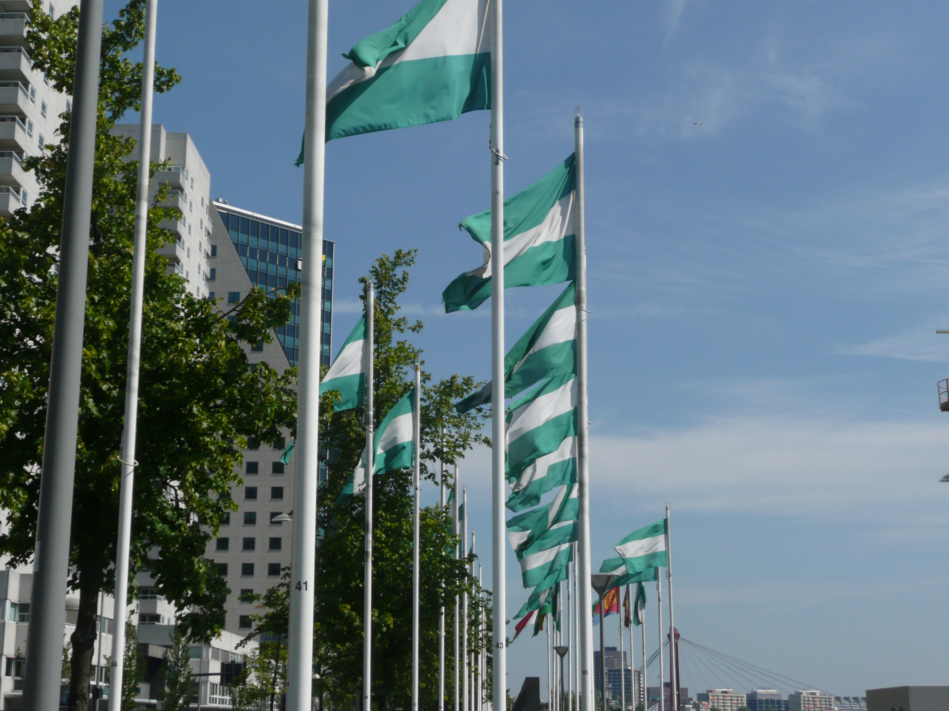 We might not have to worry about motorised traffic, but by mid-morning there are every type of human-powered wheels out and about; city bikes, road bikes, mountain bikes, tandems, tricycles, recumbent bikes, hand-cranked bikes, stand-on bikes, roller skates, scooters and people of all types too – graceful old ladies sweeping along serenely on city bikes, families shepherding children, teenagers in groups, serious road cyclists in team time-trial formation, whole pelotons of club cyclists and just hundreds of normal folk travelling from A to B using a bike. Somehow everyone seems to be able to share the small cycle tracks without mishap, but you need to watch what you are doing. We are beginning to follow our route a bit more easily by now and so we’re starting to relax a bit more. At one stage during the morning, as we were making our way across Rotterdam, Ken was actually heard to say that cycling down the A38 from Taunton to Bridgwater was easier – it might have been easier but at least we’re not in danger of being killed on a Dutch cycle track.