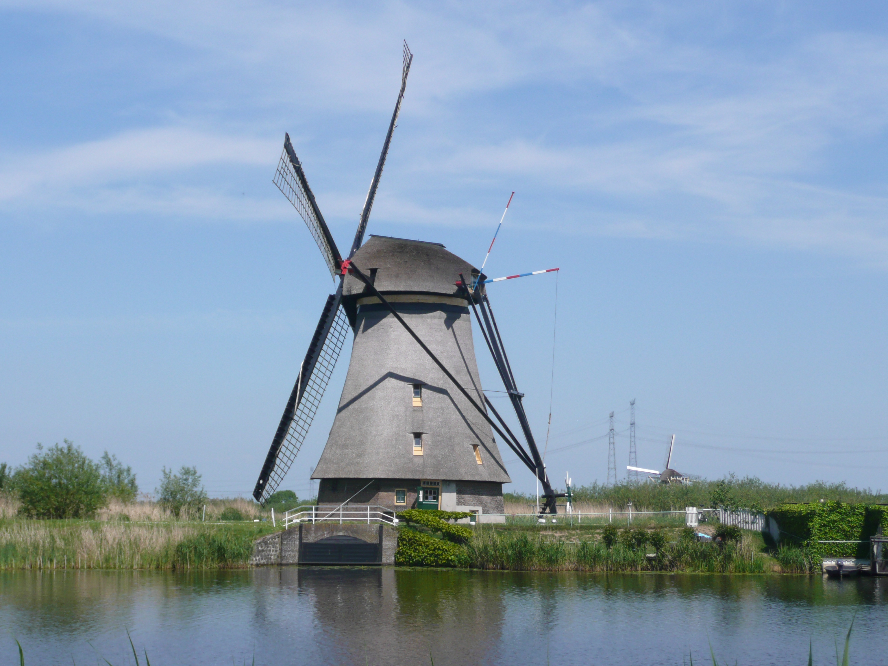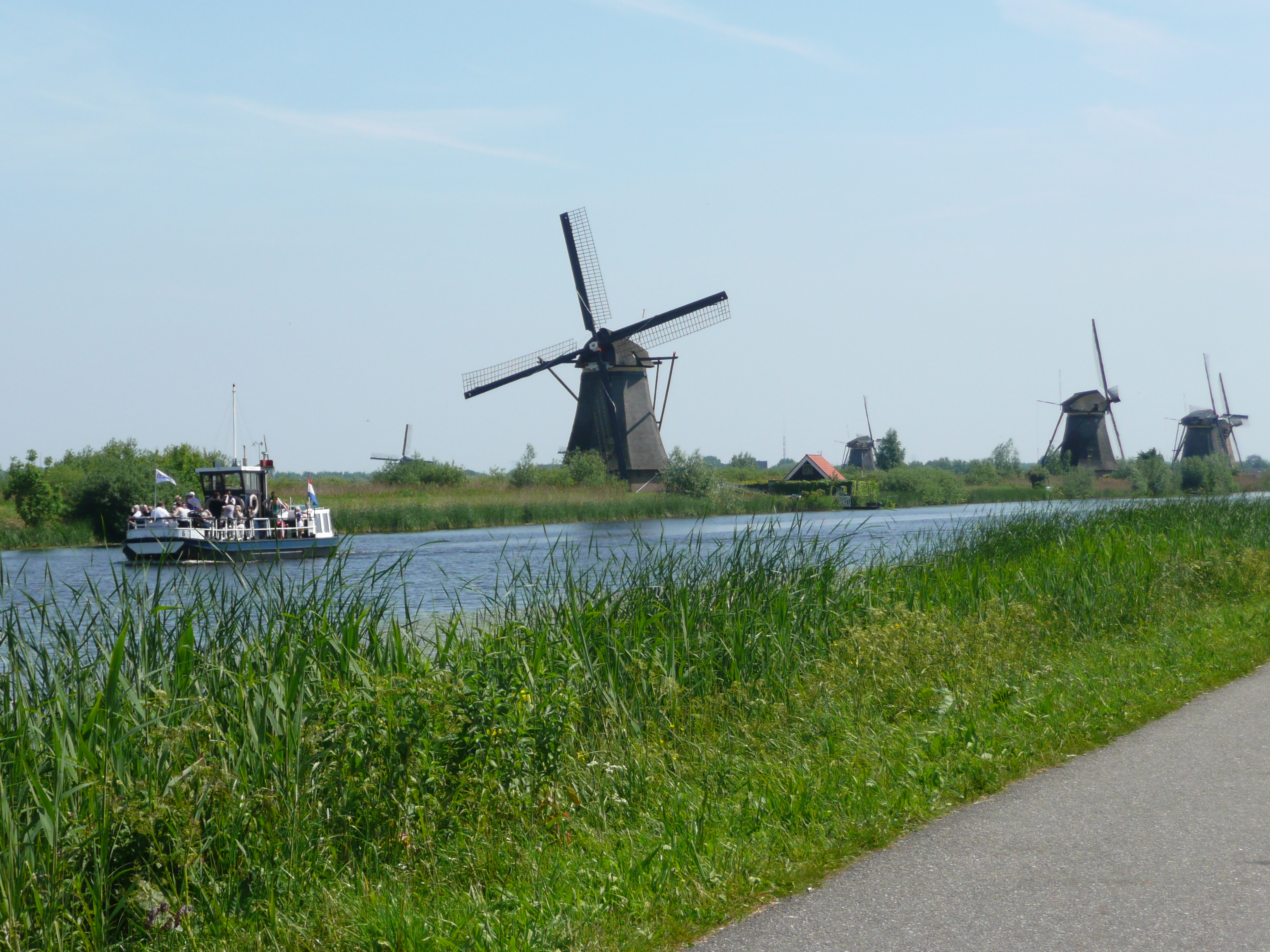 Once away from Rotterdam the countryside is showing itself off to its best – flat, as everyone knows, but criss-crossed with waterways and rows of poplar tress, fields of cows or horses here and there, and with windmills and villages dotted around. The temperature is soaring and by mid-afternoon it is scorching. We reach a place called Kinderdijk, a UNESCO World Heritage site of 19 windmills built from 1738 to 1760, some in thatch, some in brick and a couple in stone. Some of them are in full working order and we watch them having the sails set by turning the top of the mill around to face the wind. Being a weekend the place is thronged with people. We’re aiming for a town called Dordrecht, which on our map has a little blue ‘tent’ symbol. These are not always reliable on the road maps but we hope that our special cycling maps will prove themselves to be accurate. Sure enough, there is a camp-site exactly where it should be and it is open and has spaces. Couldn’t be better. We’re going to stay an extra day tomorrow to catch up on the chores (and snooze in the sun with a book).