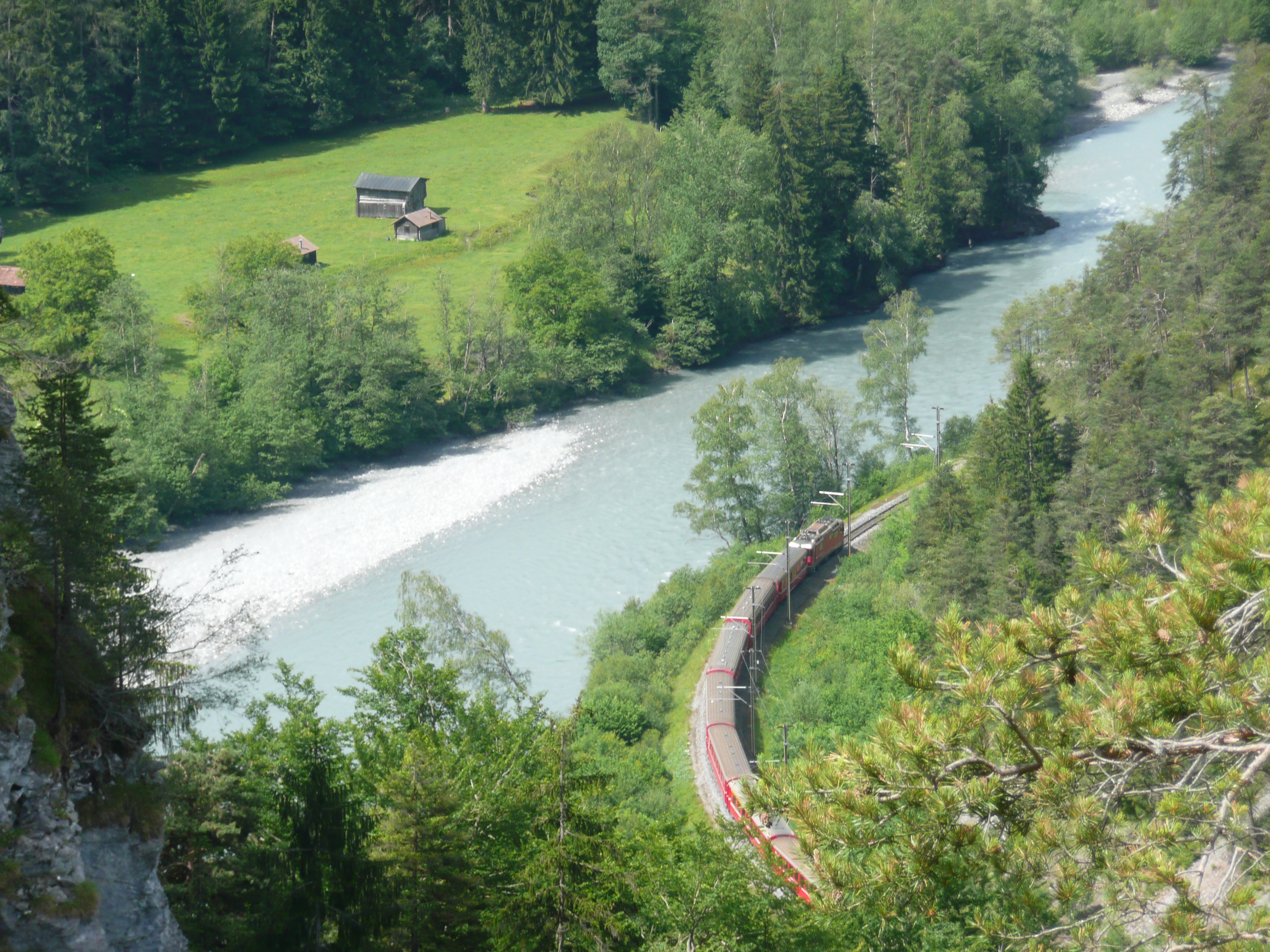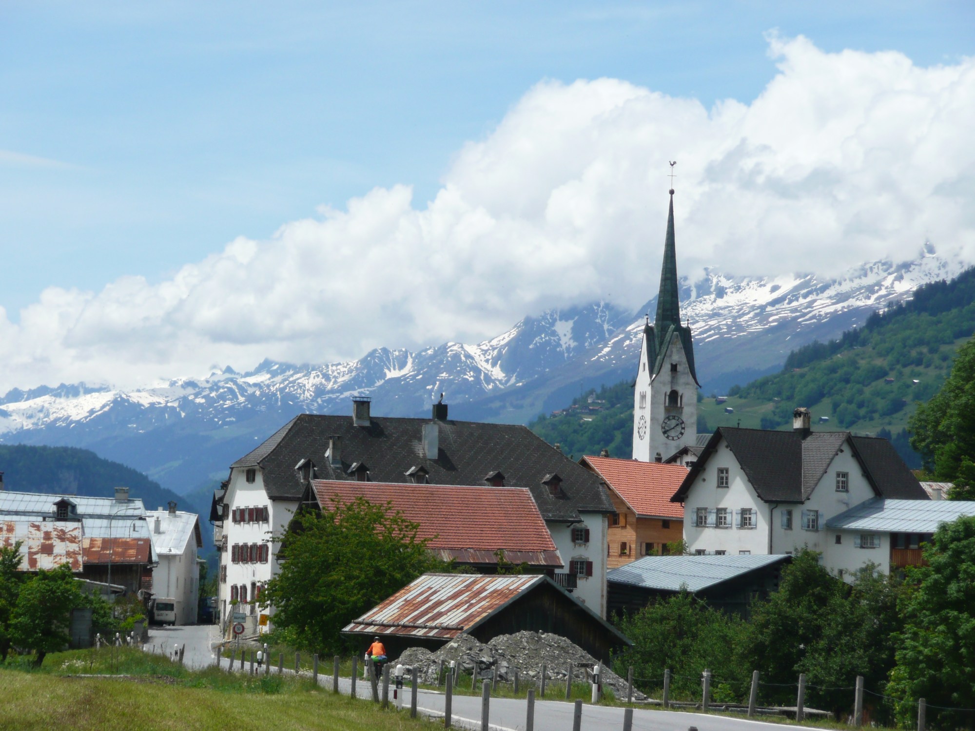 The rain kept beating on the tent all night long, so it was a slow start to the morning packing up the wet stuff again. The sun is bright as we set off, ready to begin our hardest day for a long time. When we were camping last night we could hear gunfire nearby which we thought must be clay pigeon shooting. However, we discover that it is actually an army rifle range just behind the camp-site. The cycle track passes literally only a few metres away from the soldiers and the targets – we cycle by as quickly as possible. Shortly afterwards we join a road for the first time for a long time. Fortunately, it is a quiet alpine road climbing its way up the valley through woods to start with before opening out onto alpine meadows. The views are just breathtaking with snow-capped mountains all around. We can see the Rhine below in the valley bottom with the Glacier Express rail line running alongside. The road makes its way through one or two little villages which are so pretty you feel that they cannot be real – do real people actually live in places like these?