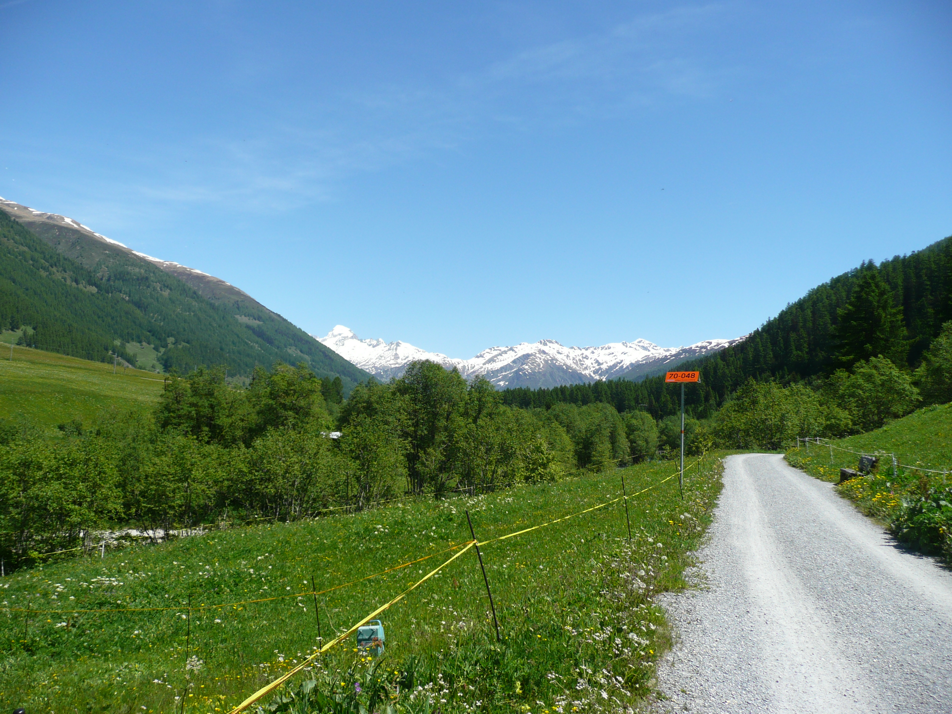 The other side of the tunnel the cycle track is marked with the same system as we have been using all the way up from Holland. The route is a long distance cycle route following the Rhone from its source to the Mediterranean sea. However, the first part of the route is along the main road, busy with weekend traffic. In Switzerland the traffic has a much larger than normal proportion of classic cars, sports cars and supercars like Ferraris, Lamborghinis and such like, and the driving is as you would expect – fast and furious. Not really compatible with wobbly overloaded bikes. Fortunately, after about 10 kilometres the signs point us off onto a cycle track. This turns out to be a mixed blessing. The scenery is still stunning but the path is a nightmare. It is a stone and rock track with lots of short, steep inclines which just cannot be ridden up on touring bikes. Even the mountain bikers going by had to get off and walk.