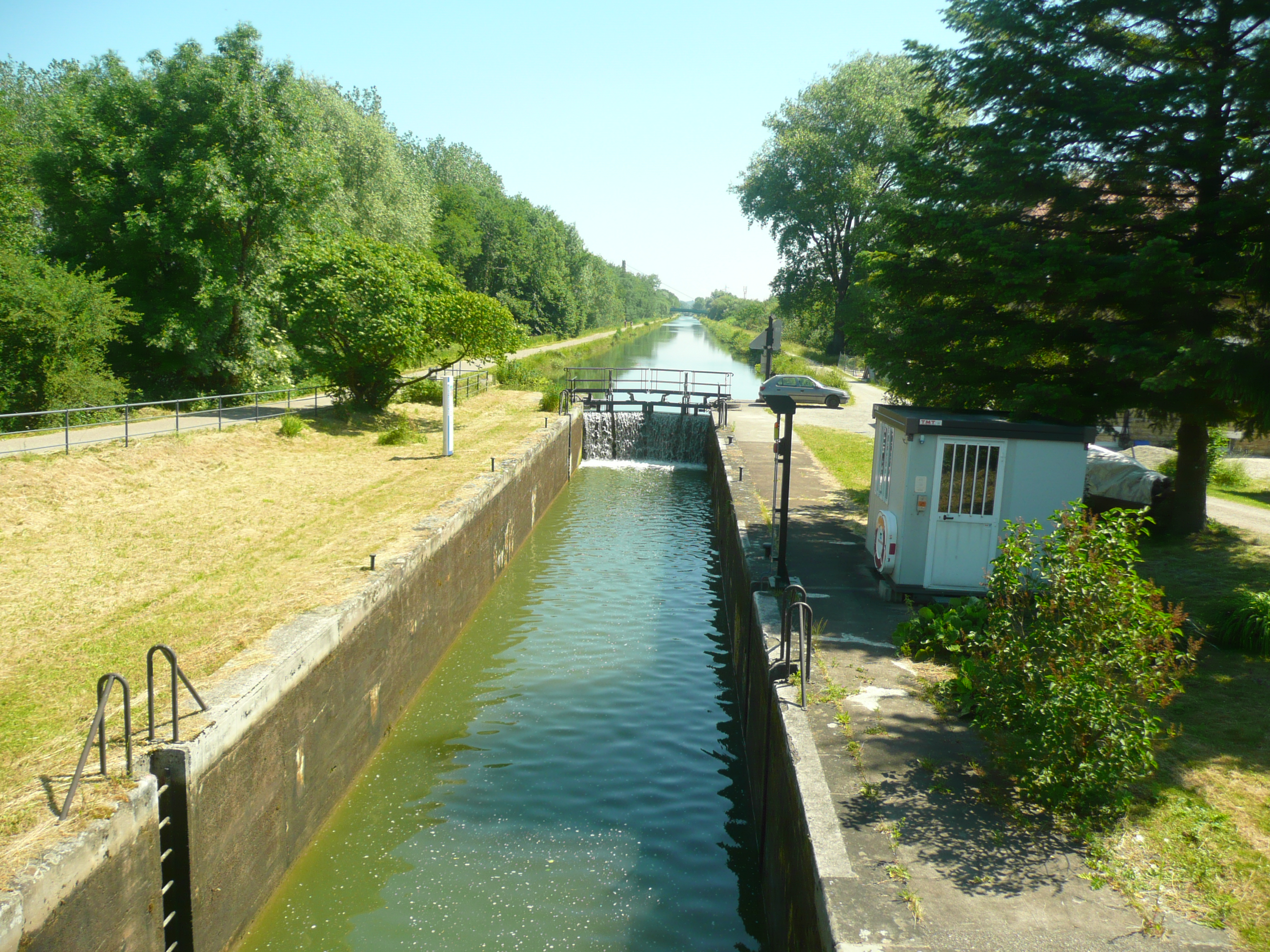 As the day goes on, although the headwind stays with us, the locks suddenly change and go in our favour, downhill, starting with a staircase of 13 locks in a row. A welcome respite.