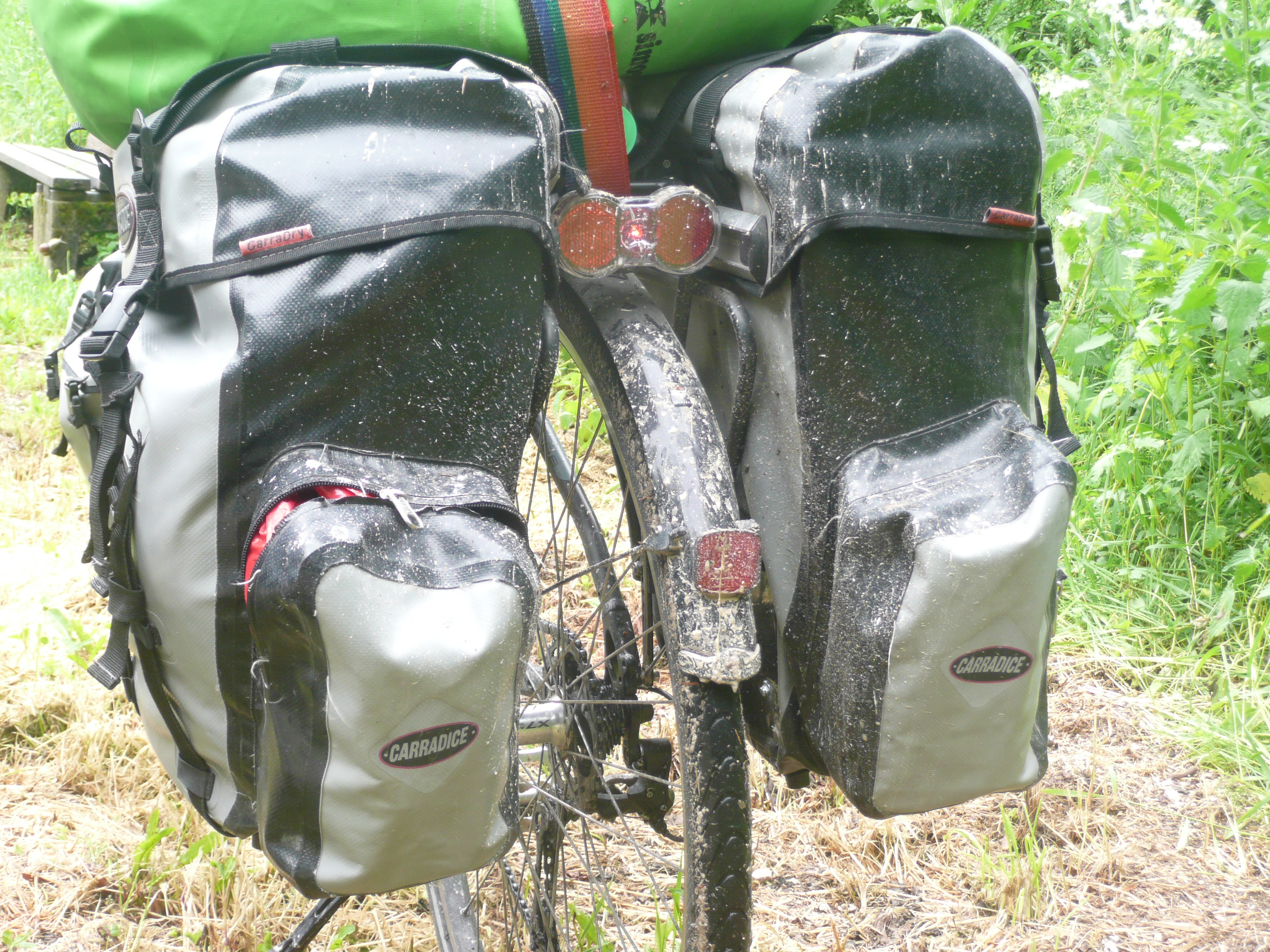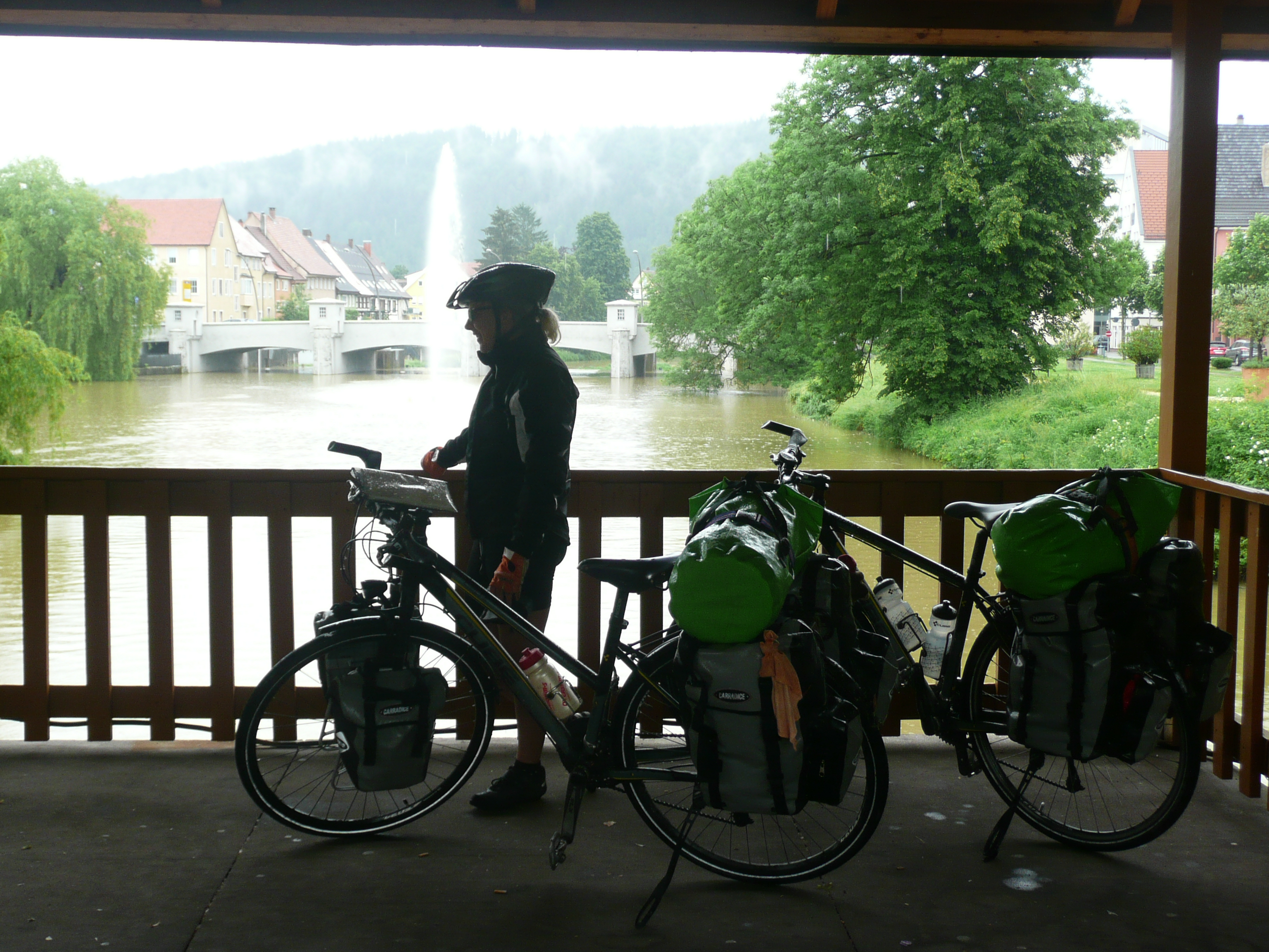 Fortunately, the route is flat because we are fighting a headwind and torrential rain. So far on this trip we have been very lucky that when it has been raining it has been fine drizzle that makes you damp rather then wet. Not today however, this stuff wets you to the skin, even through two layers of ‘waterproof’ jackets. It is not so bad whilst you are pedalling hard, as you keep warm, but once you stop the cold and the wet get to you. We shelter for a while inside a covered bridge, but to no avail. The rain just keeps coming.