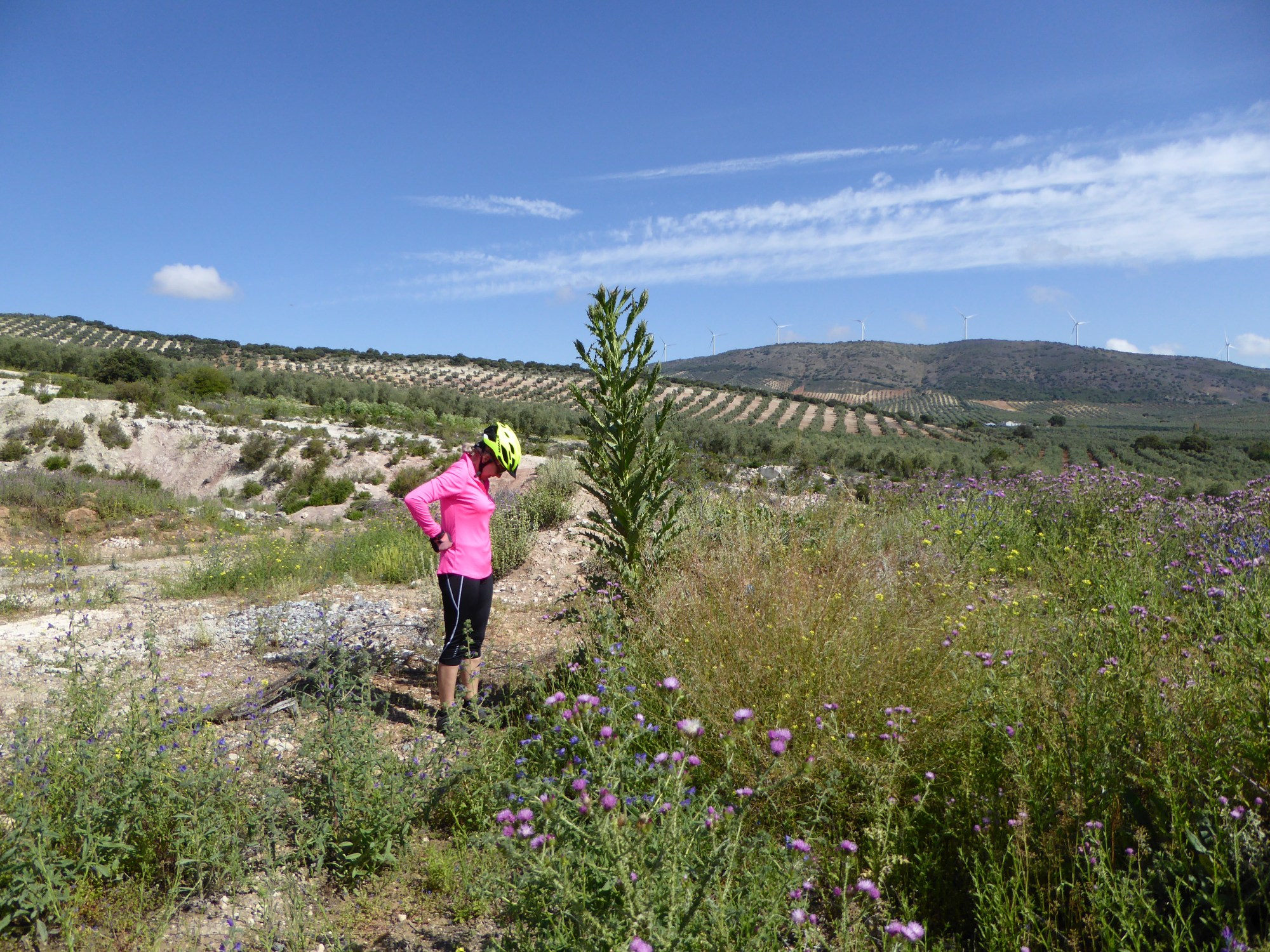 We have another sunny day, not too hot, another perfect cycling day, with undulating roads but not too challenging. We pass through Fuente de Piedra where we stayed on our second day. There is a saline lagoon here which is the second largest breeding site in Europe for flamingos. Several thousand flamingos can be seen here earlier in the year. We learnt on our river tour of the Doñana national park that the flamingos breeding at Fuente de Piedra have to fly to Doñana to collect food to feed to their young. A round trip of 400 kilometres. This explains why we often hear flamingos flying over our house late in the evenings (they make a distinctive honking noise a bit like geese whilst they are flying). When we passed the lagoon a couple of weeks ago there was still a small amount of water left, but now, after two weeks, all the water has gone to leave a white salt pan – so bright in the sun it hurts the eyes to look at it. It will stay dry now until the winter rain refills it and once again it brings the spectacle of thousands of pink, strutting birds.
