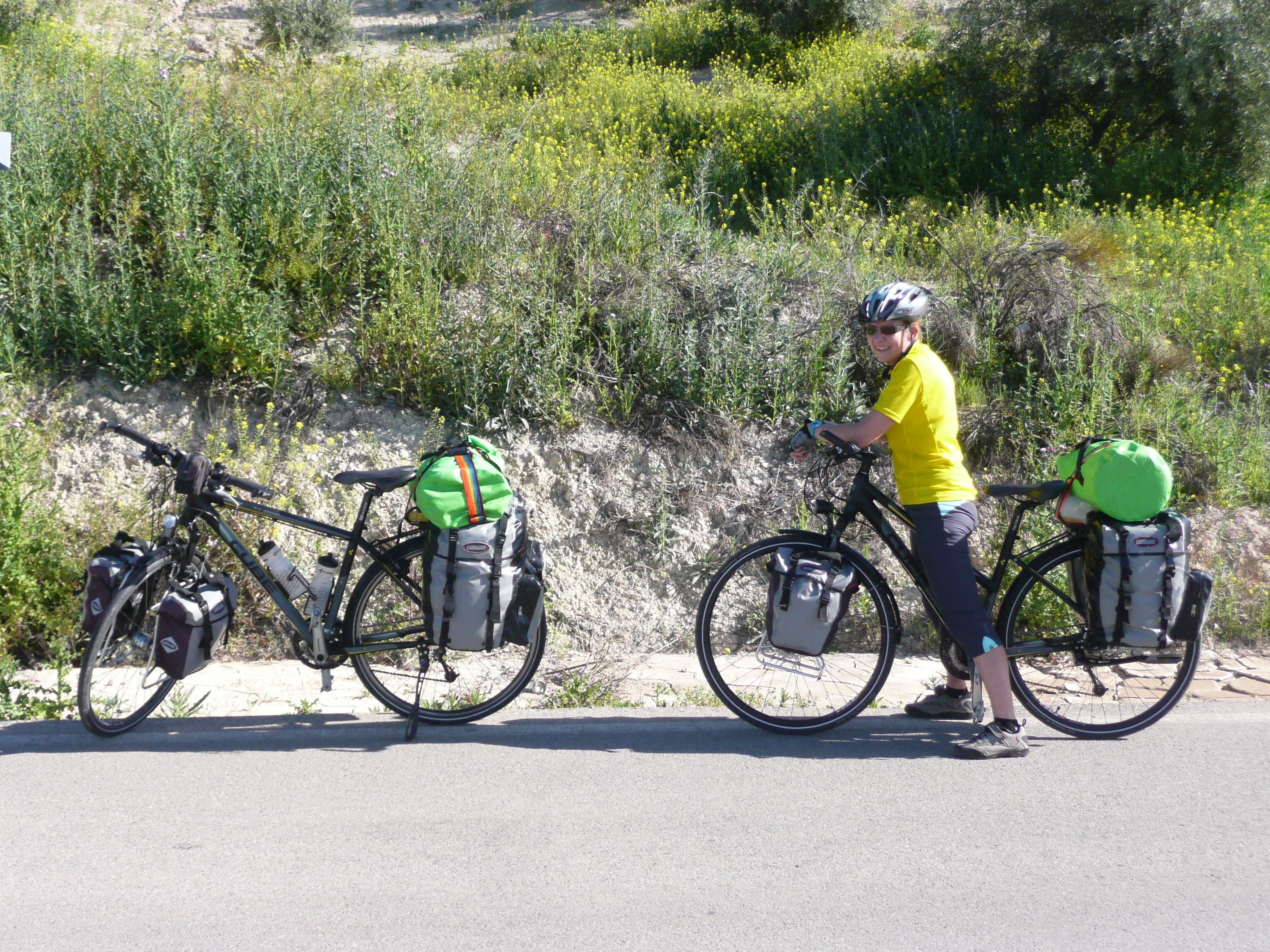 Bags: Carradice CarraDry front and rear panniers, Simond watertight holdalls, handlebar map holder, stuff bags (for clothes). Updated for 2018 to Ortlieb rear and front panniers, rackpacks and handlebar bar bags.